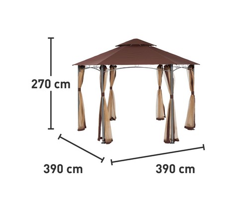 Предлагаем вам приобрести крышу-тент, предназначенную для садового павильона laurel bay. Крыша-тент подойдёт для садового павильона, высота которого составляет 270 см, длина 390 см, а ширина 390 см. Тент имеет коричневый цвет, он способен защитить от прямых солнечных лучей и осадков.
