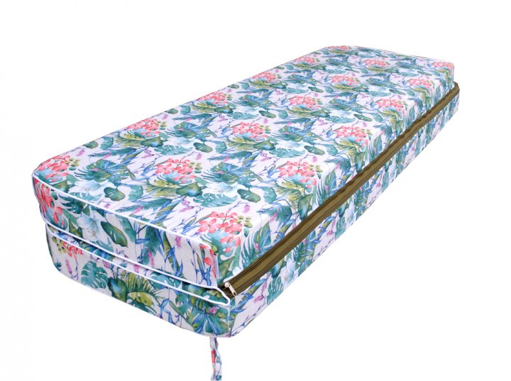 Данный матрас предназначен для садовой качели. Такие матрасы изготавливаются из универсальных тканей, изготовленных в Испании. Благодаря тому, что в такой ткани огромный процент натуральных волокон, она замечательно пропускает воздух, а также является максимально приятной на ощупь. Эта ткань устойчива к появлению пятен, она с лёгкостью разглаживается. Наполнитель изготовлен из пенополиуретана вторичного вспенивания. Спинка, а также сиденье матраса выполнены на молнии, поэтому наполнитель с лёгкостью можно вынуть, а чехол легко можно постирать. Для того, чтобы матрас надёжно держался на качели, на нём есть специальные завязки по бокам.
